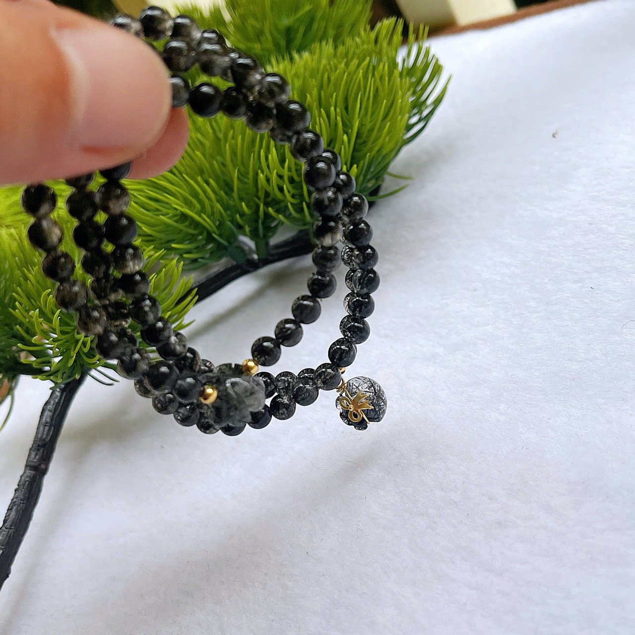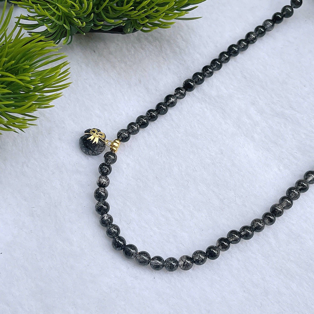 Mẫu chuỗi thạch anh tóc đen tự nhiên, hạt trong có ánh kim tóc mạnh mẽ – vừa cá tính vừa mang ý nghĩa phong thủy thu hút tài lộc, bảo vệ năng lượng.