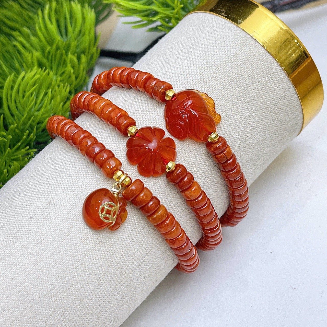 Chuỗi phỉ thúy huyết dạng bánh xe quấn 3 vòng nổi bật với gam đỏ cam ấm áp, mang nguồn năng lượng tích cực, giúp cân bằng cảm xúc, thu hút may mắn và tăng vượng khí cho người đeo. Thiết kế hiện đại kết hợp charm bạc tinh xảo tạo nên điểm nhấn sang trọng và ý nghĩa phong thủy sâu sắc.