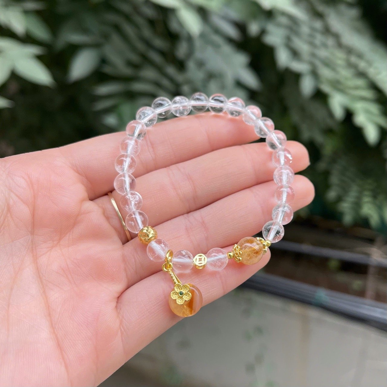 Vòng tay thạch anh trắng trong suốt, tinh khiết kết hợp cùng charm đồng điếu và phụ kiện titan cao cấp, tạo nên vẻ đẹp thanh lịch – nhẹ nhàng nhưng vẫn nổi bật. Thiết kế tinh xảo, dễ phối đồ, phù hợp đeo hằng ngày hoặc làm quà tặng ý nghĩa.