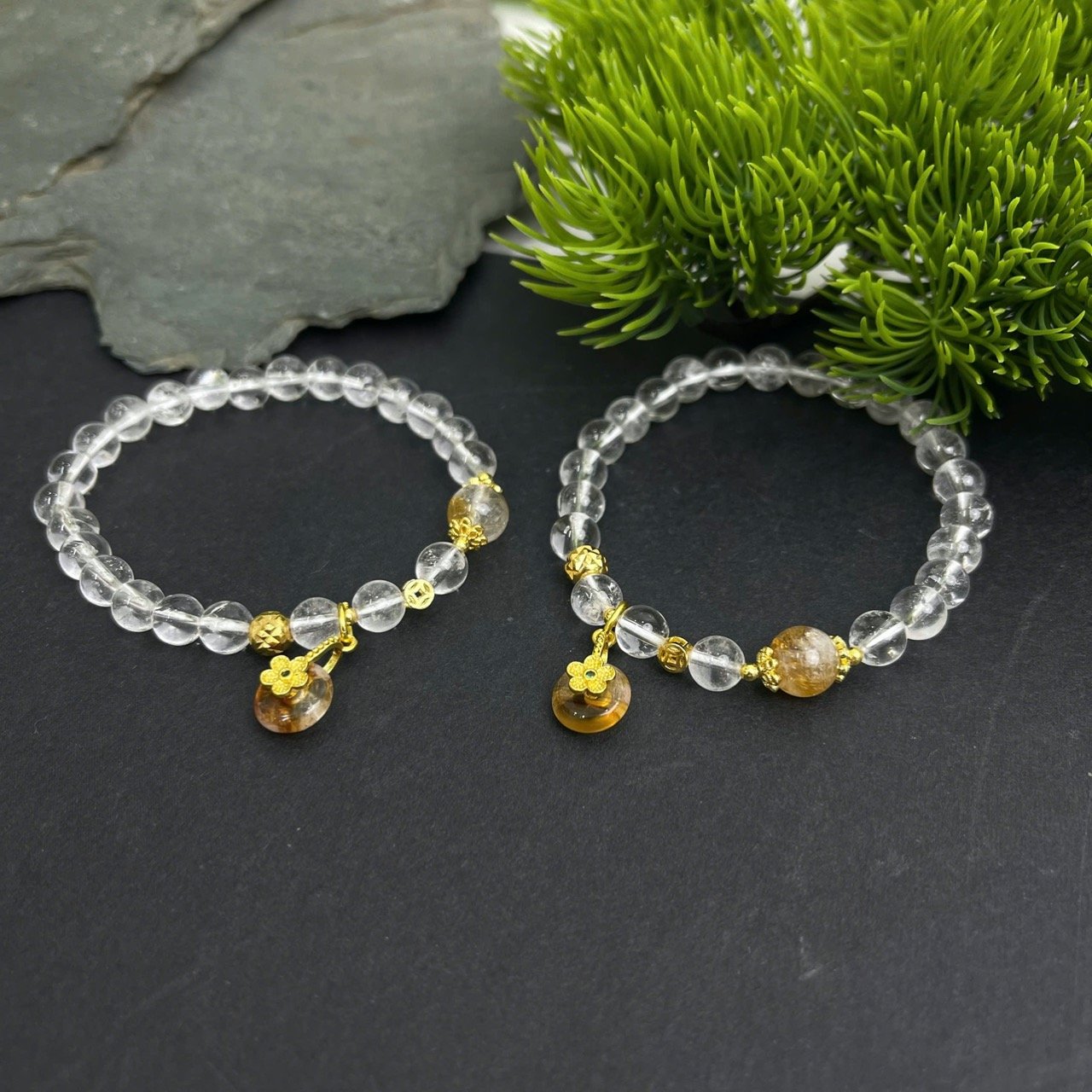 Chất liệu: Thạch anh trắng tự nhiên + đồng điếu + charm titan cao cấp
