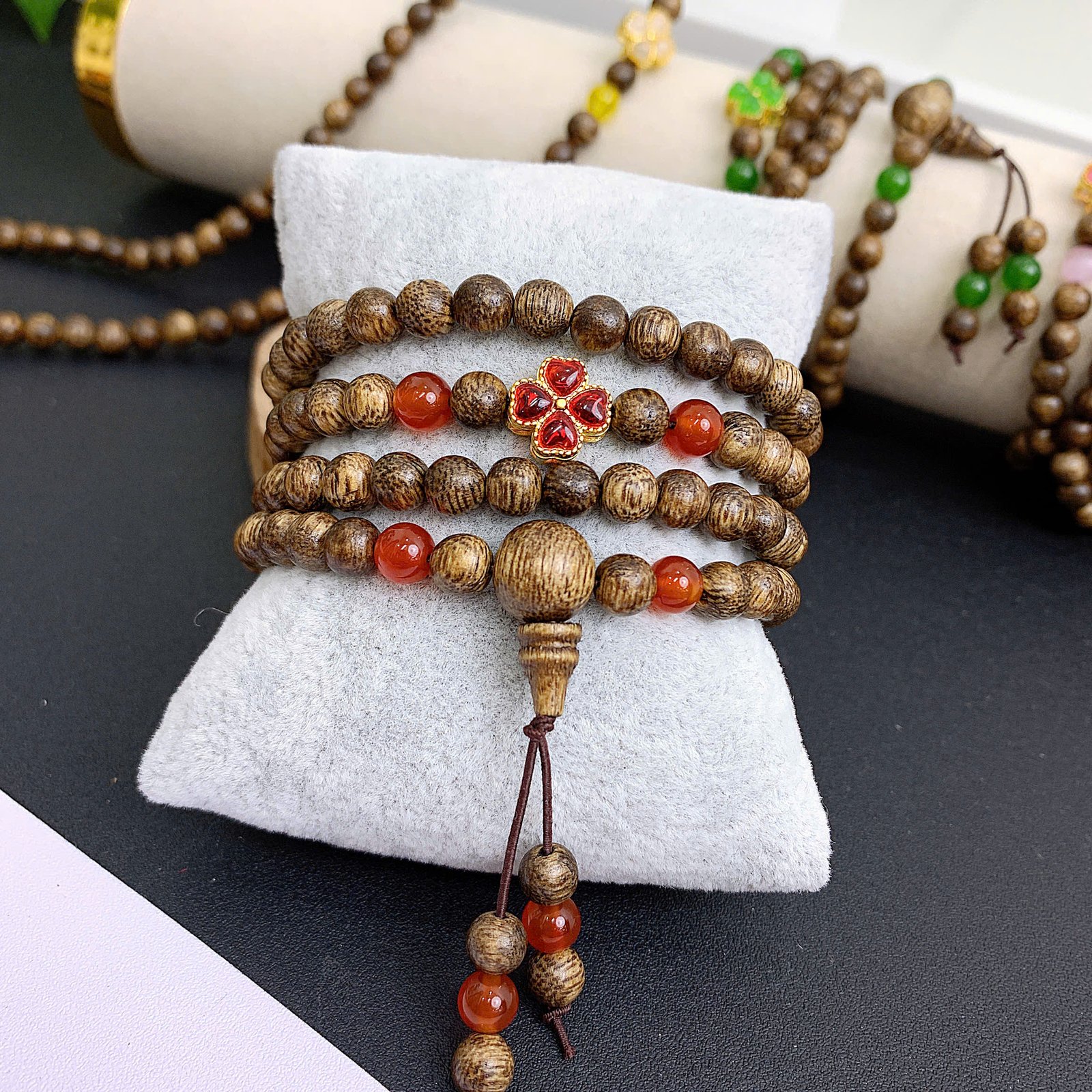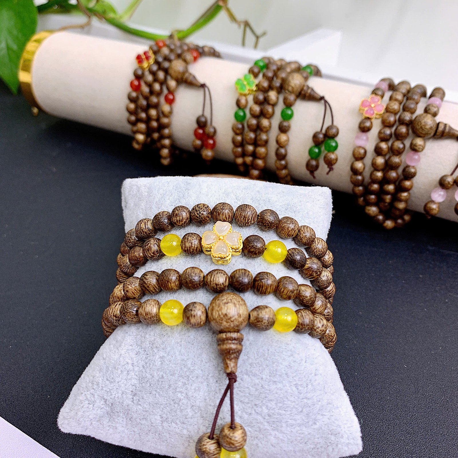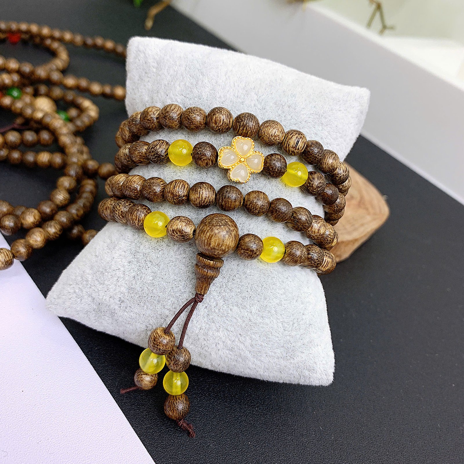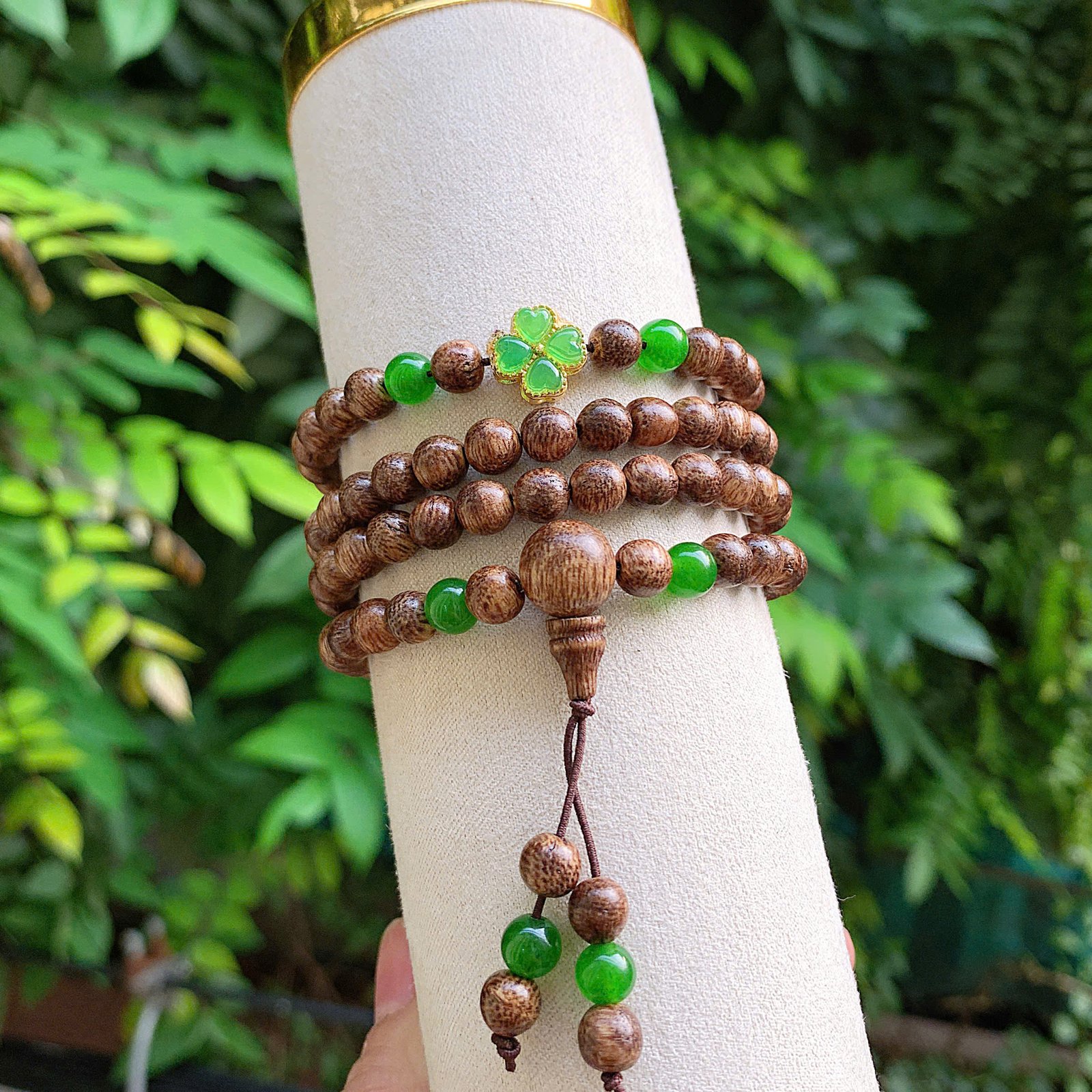 🌿 Vòng tay trầm tốc 108 hạt mix cỏ 4 lá may mắn 🍀