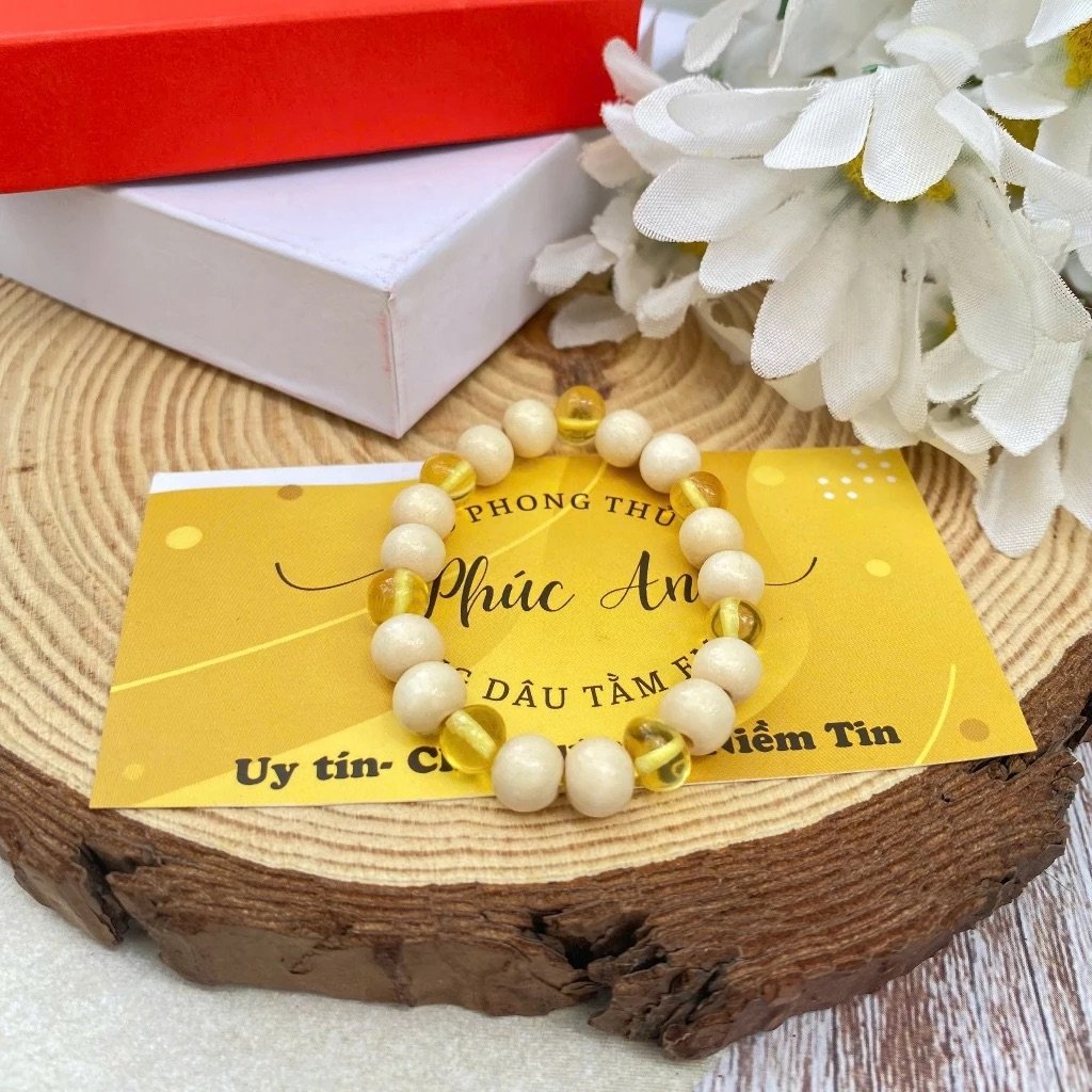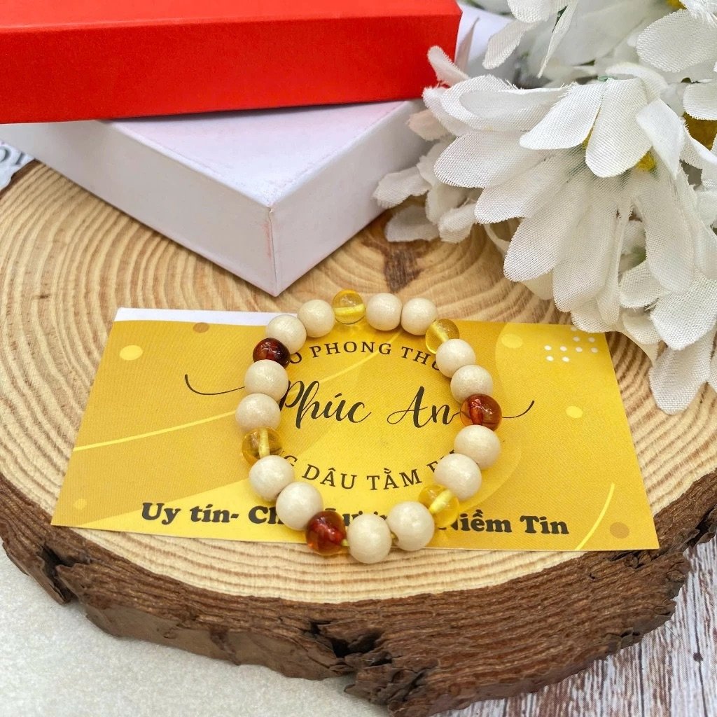 Vòng tay Dâu Tằm mix Hổ Phách là sự kết hợp tinh tế giữa dâu tằm tự nhiên và hổ phách Nga cao cấp, không chỉ mang ý nghĩa phong thủy mà còn hỗ trợ bé ngủ sâu giấc, ít quấy khóc hơn.