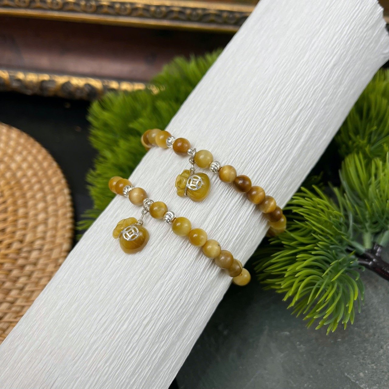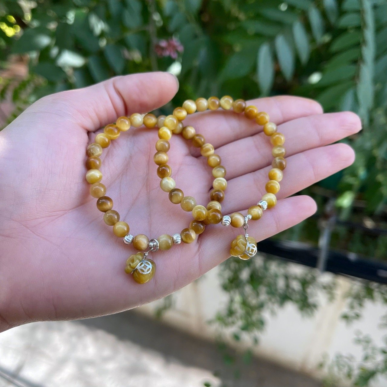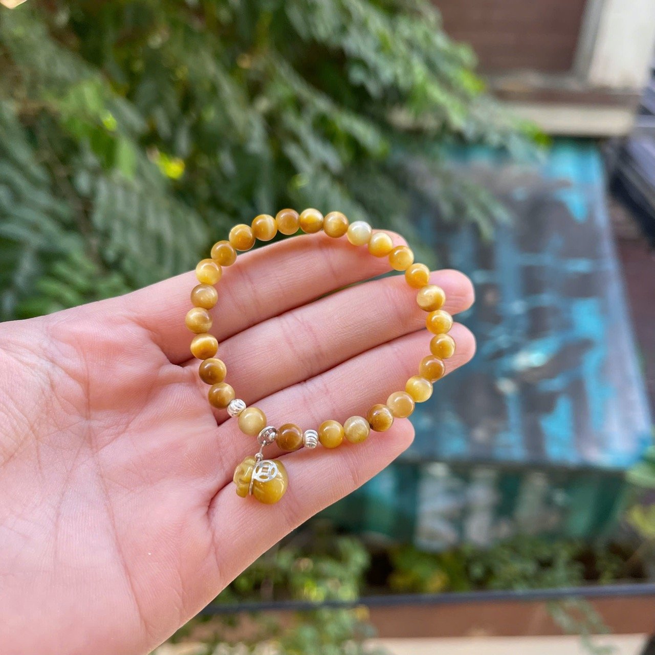 Vòng tay được chế tác từ đá Mắt Hổ vàng tâm tự nhiên với sắc vàng nâu ánh kim nổi bật, kết hợp charm túi tiền bạc tinh xảo – biểu tượng của tài lộc và sự sung túc. Thiết kế nhỏ gọn, tinh tế, dễ đeo hằng ngày.