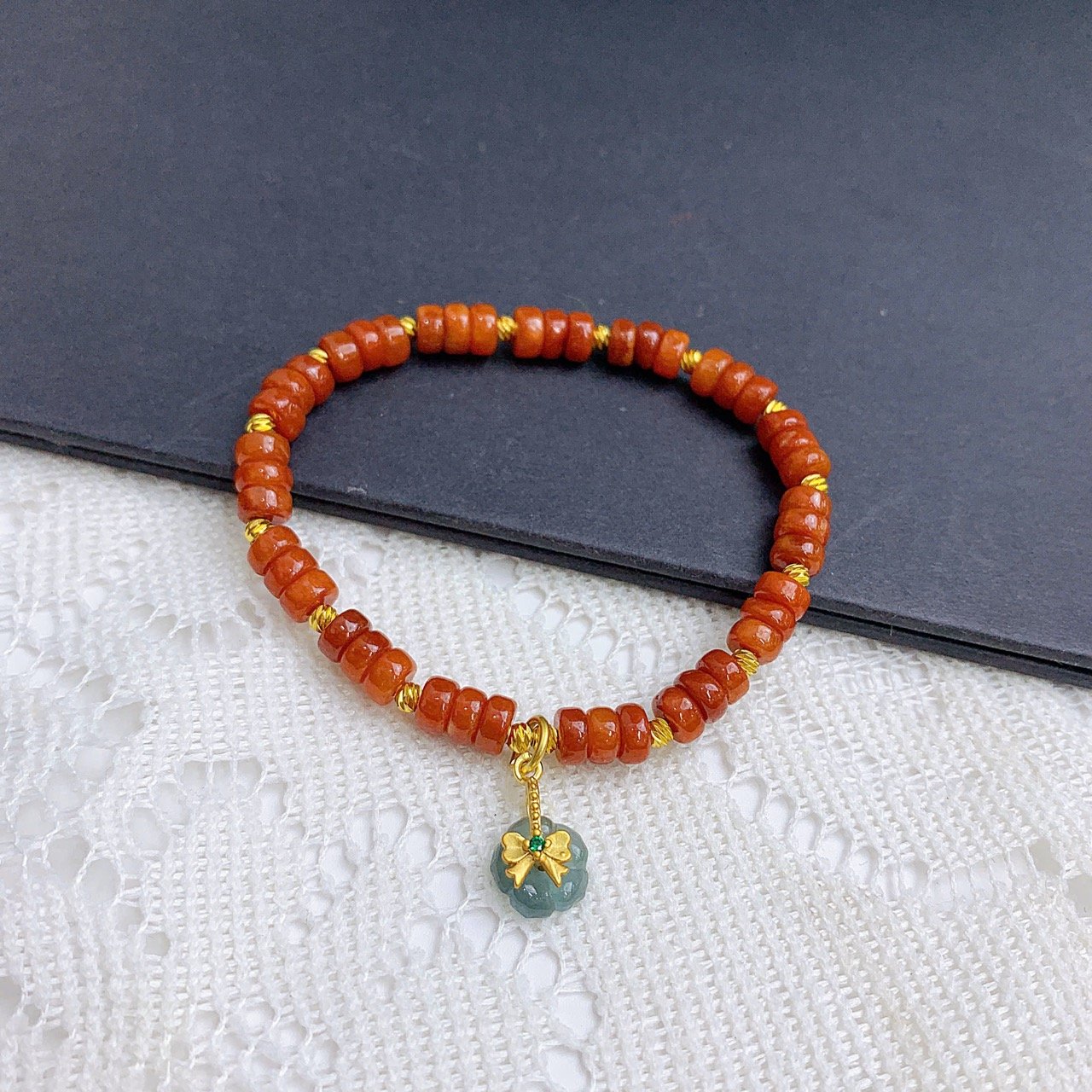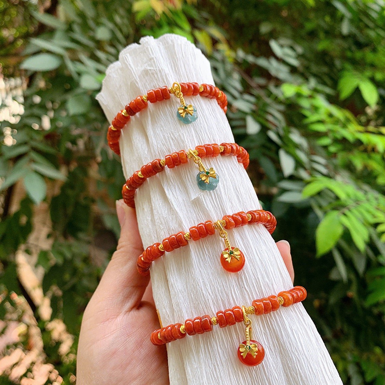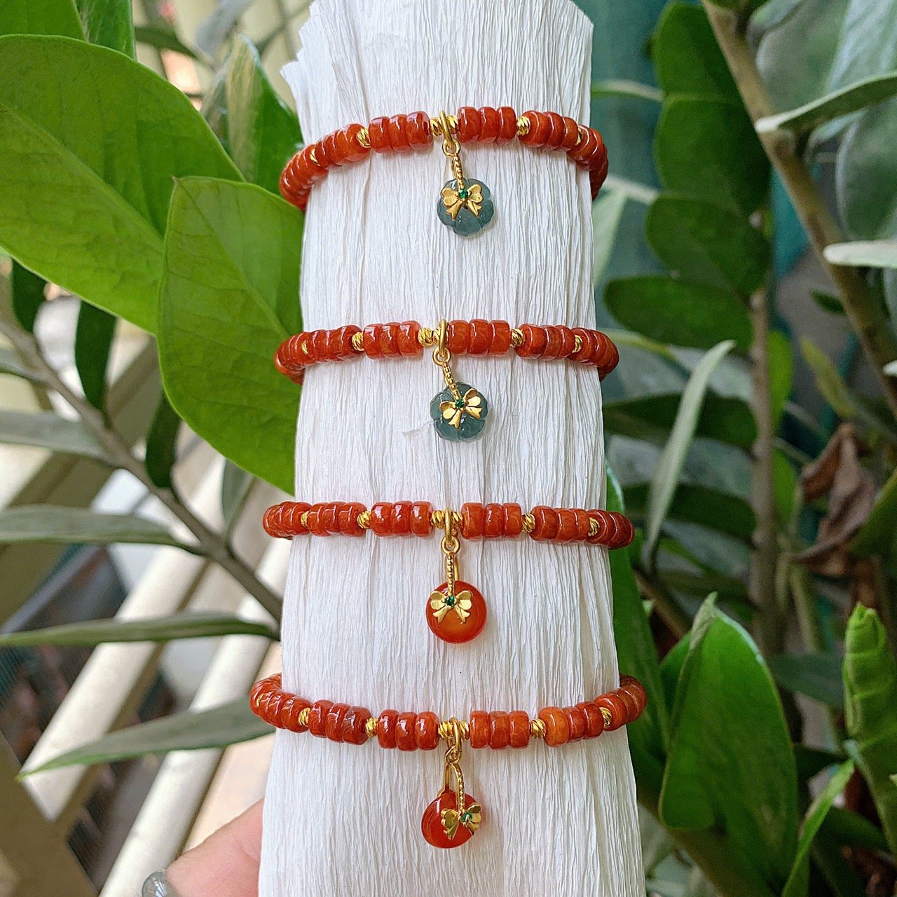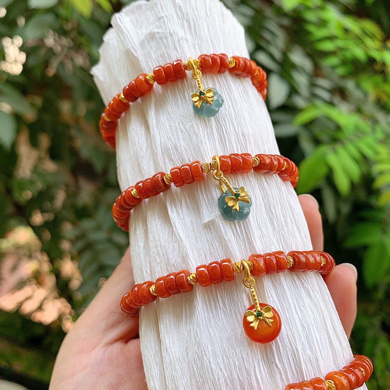 Sắc đỏ ấm của ngọc phỉ thuý huyết mang đến cảm giác sang trọng, nổi bật và đầy năng lượng. Thiết kế dạng hạt dẹp độc đáo, lên tay ôm gọn, nhẹ và rất tôn da – càng đeo càng bóng đẹp.