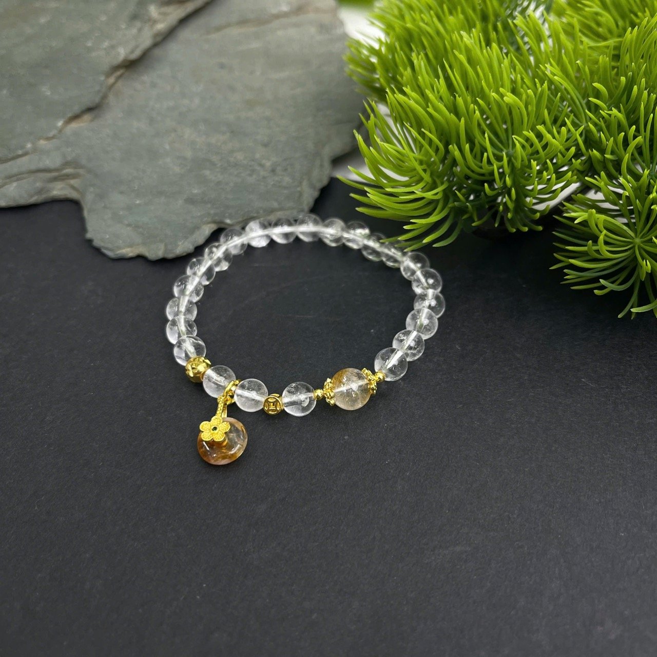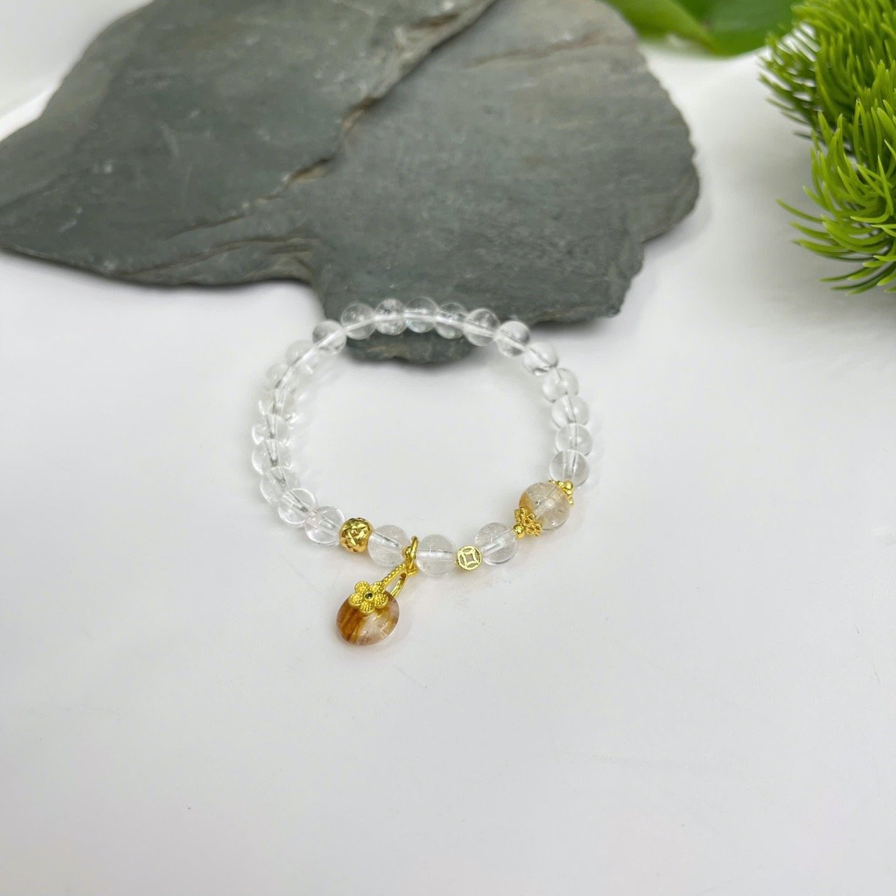 Vòng tay thạch anh trắng trong suốt, tinh khiết kết hợp cùng charm đồng điếu và phụ kiện titan cao cấp, tạo nên vẻ đẹp thanh lịch – nhẹ nhàng nhưng vẫn nổi bật. Thiết kế tinh xảo, dễ phối đồ, phù hợp đeo hằng ngày hoặc làm quà tặng ý nghĩa.